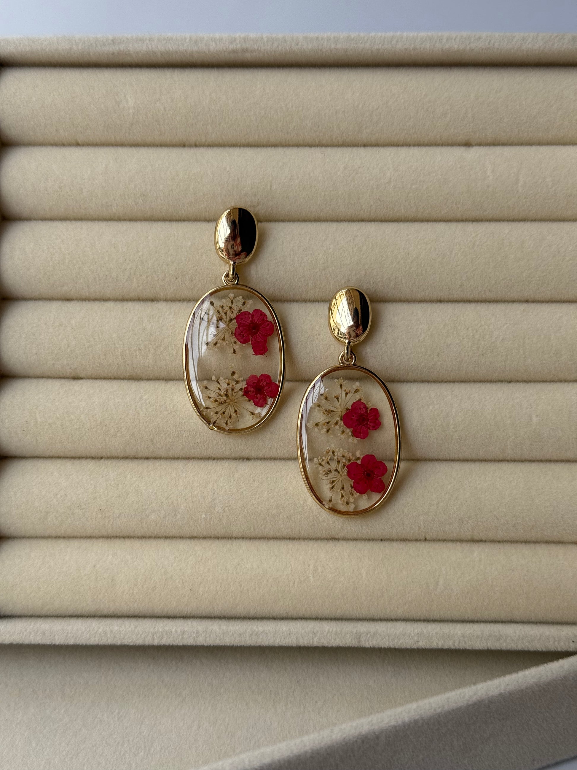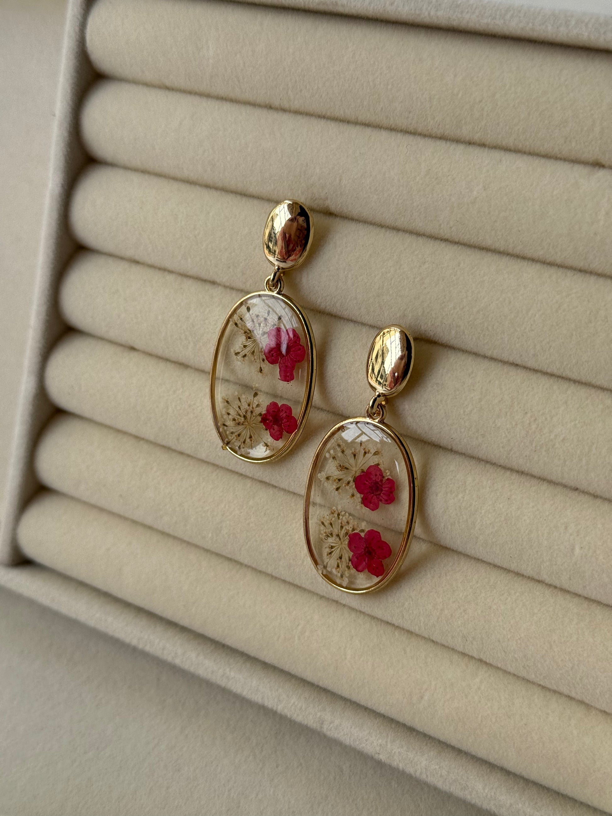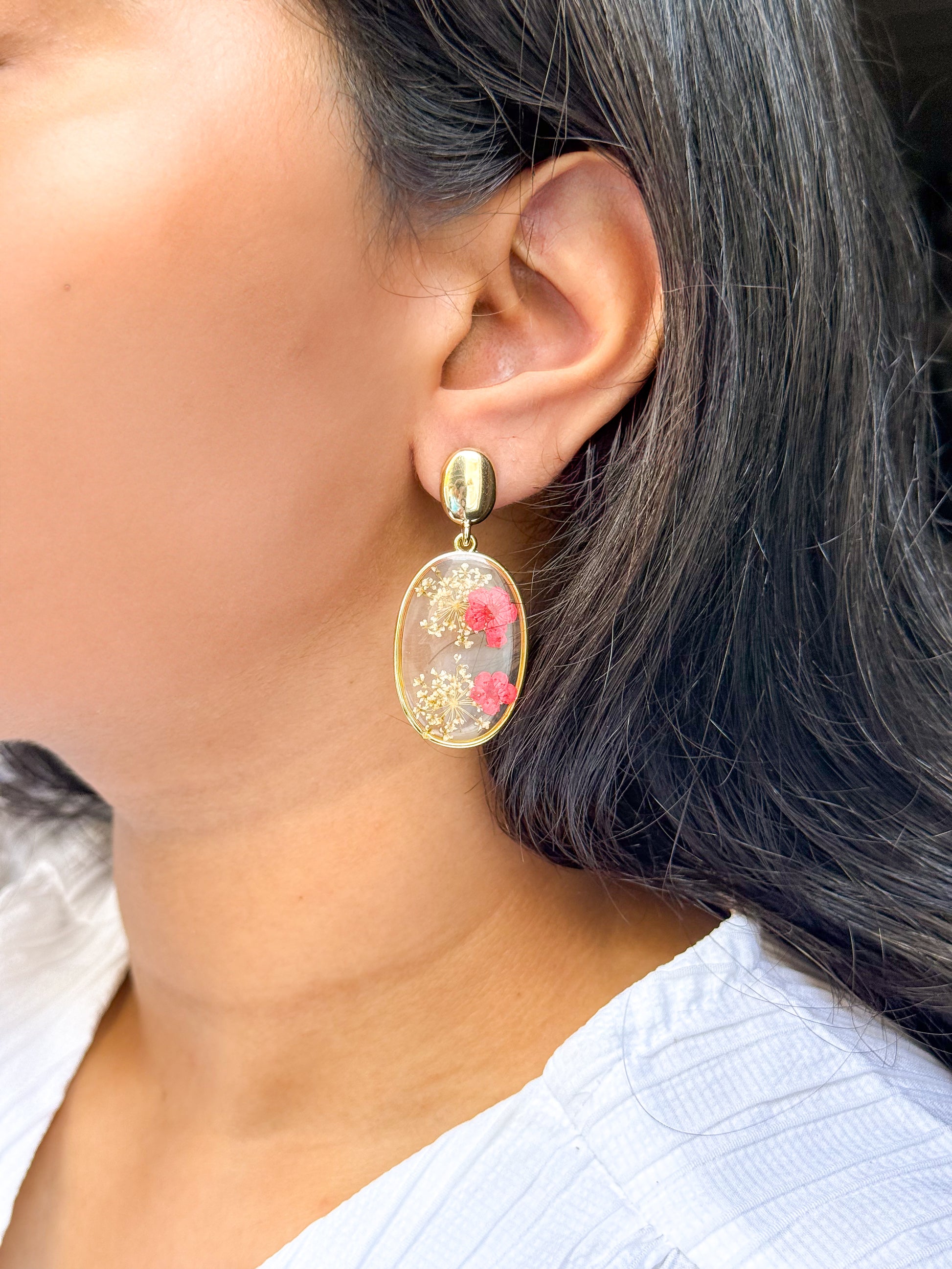 Add a touch of nature-inspired elegance to your look with these stunning gold-plated resin earrings. Featuring real dried pink and ivory flowers encapsulated in crystal-clear resin, each piece is uniquely handcrafted and beautifully set in an oval gold frame. Lightweight and comfortable for all-day wear, these earrings are perfect for casual outings, special occasions, or gifting. Presented on a rustic wooden display, they evoke a charming boho-chic aesthetic. Embrace natural beauty with every wear.