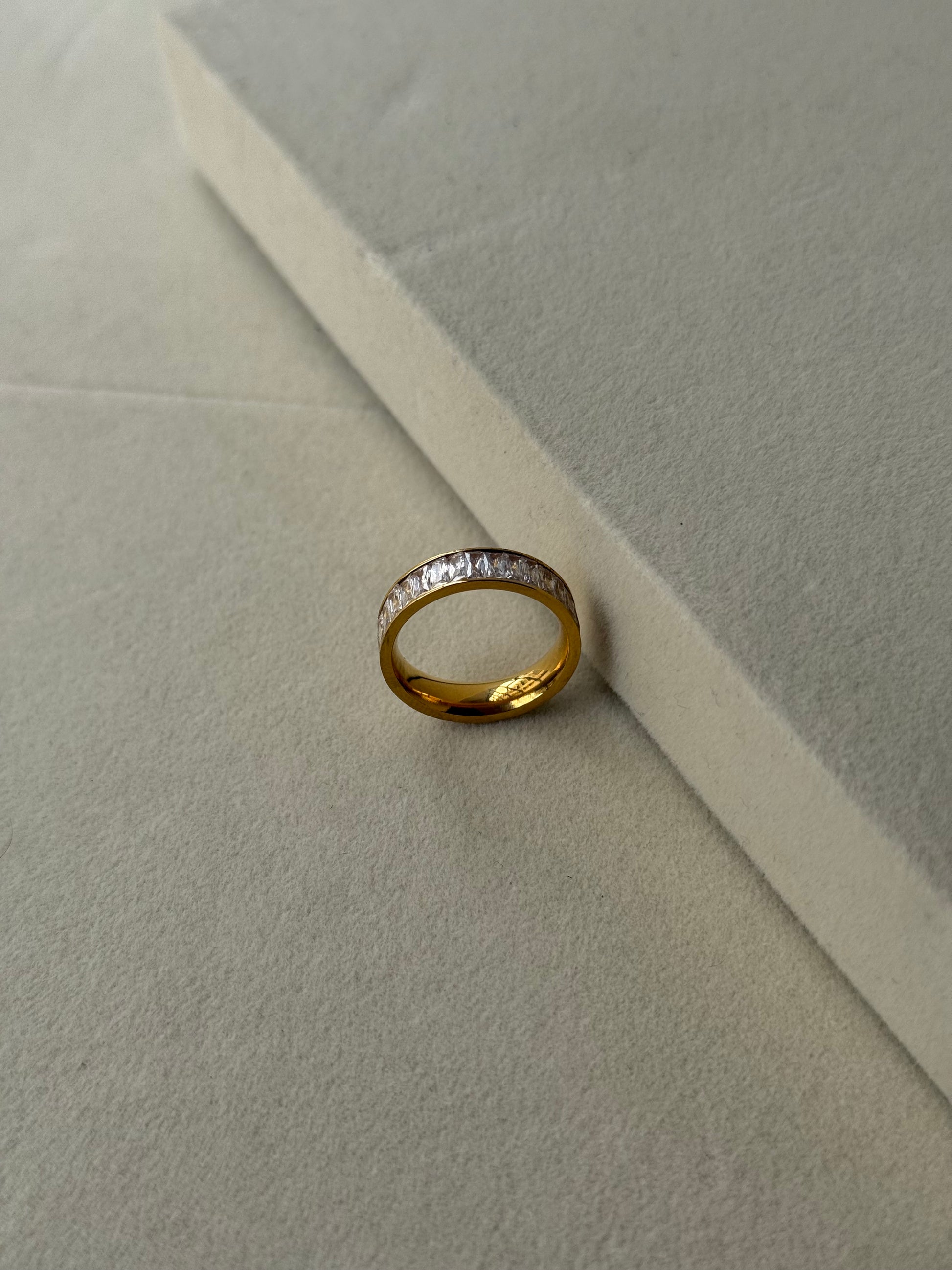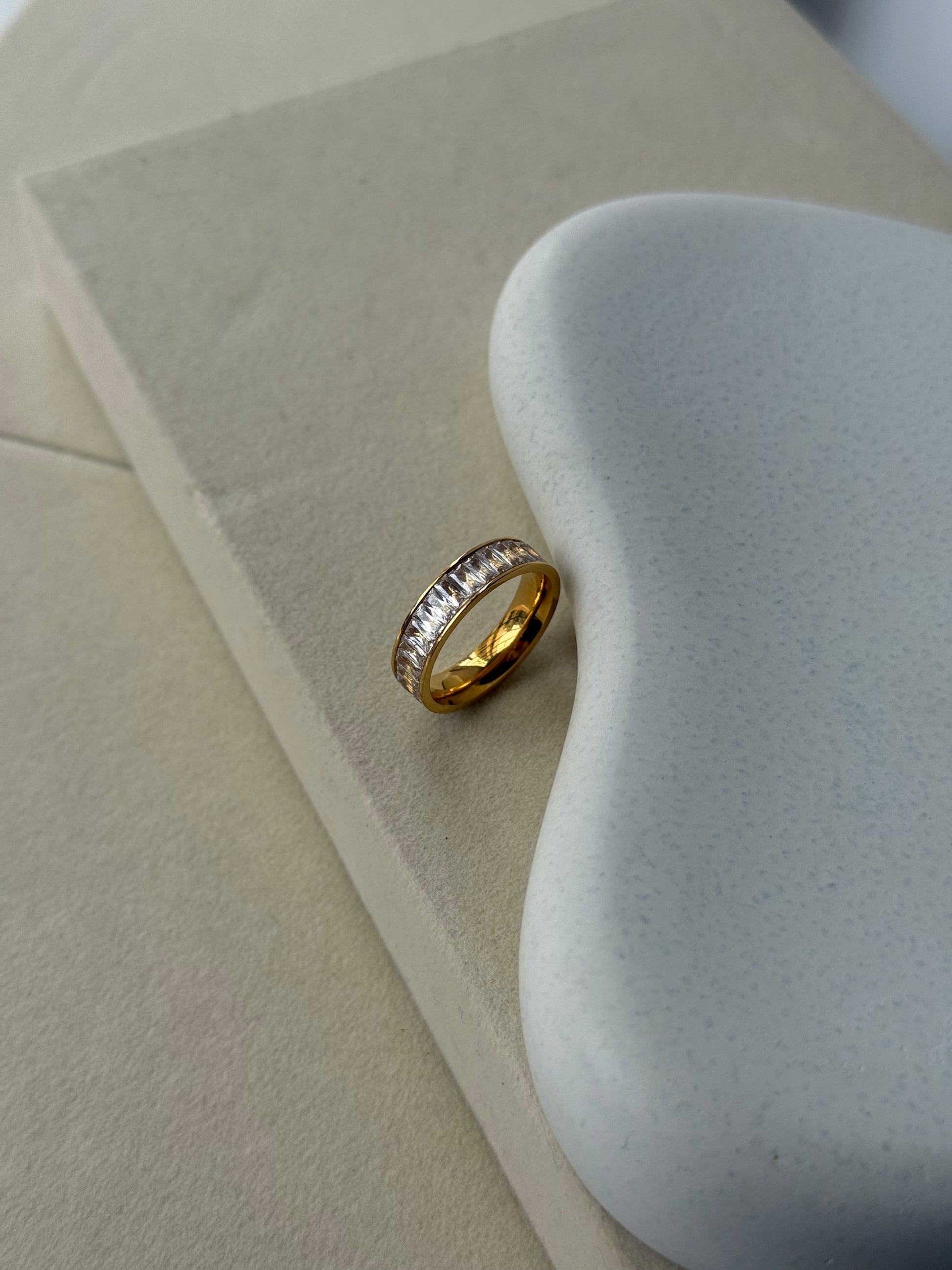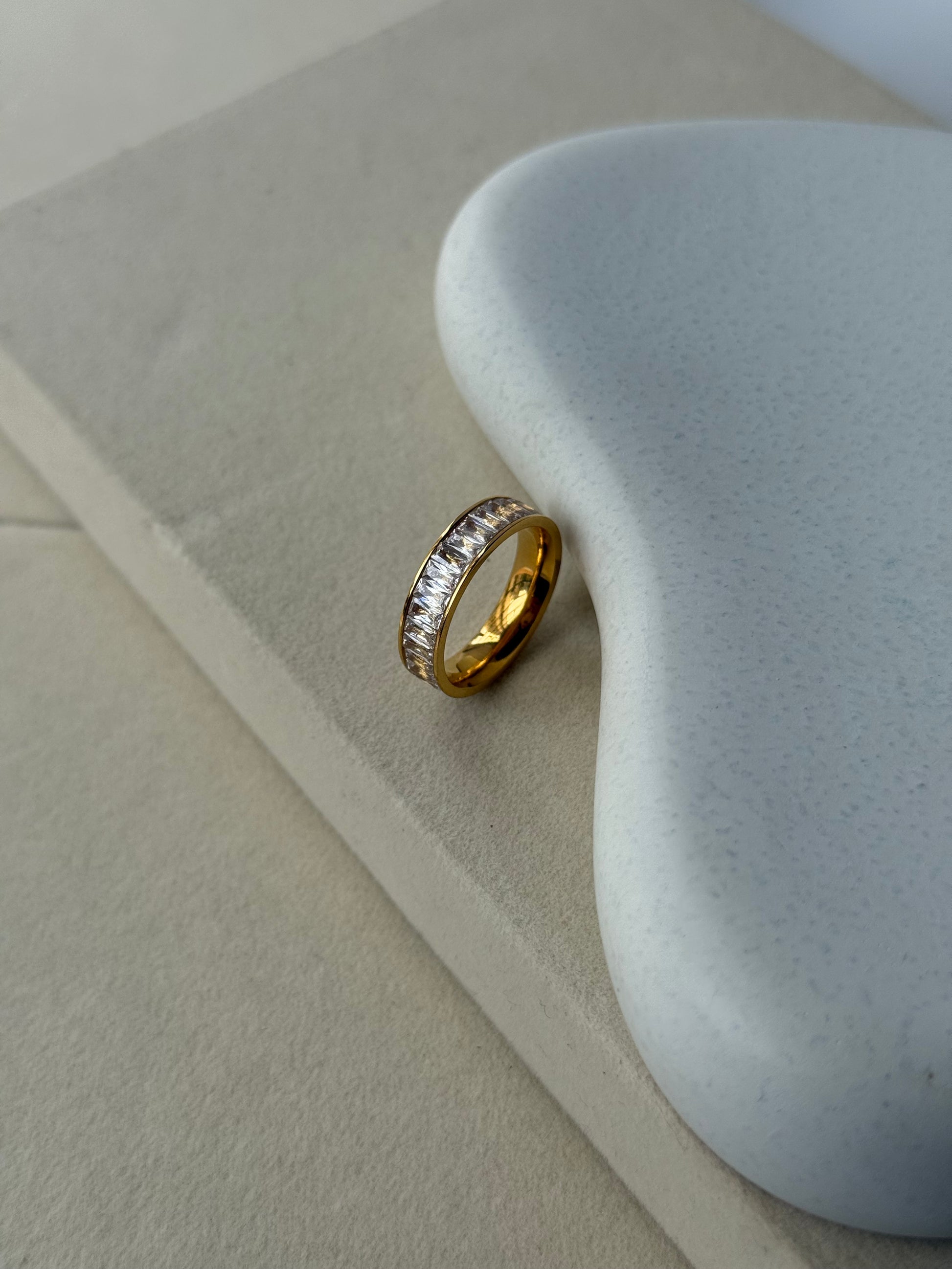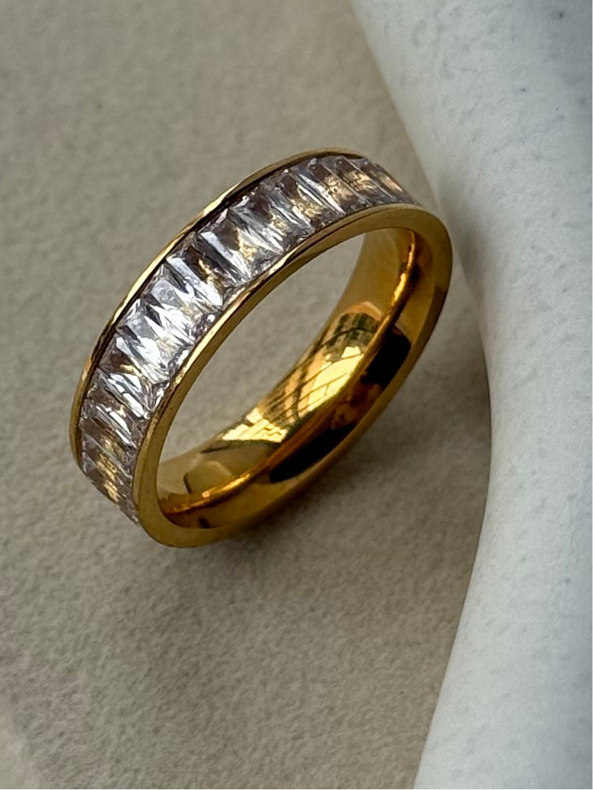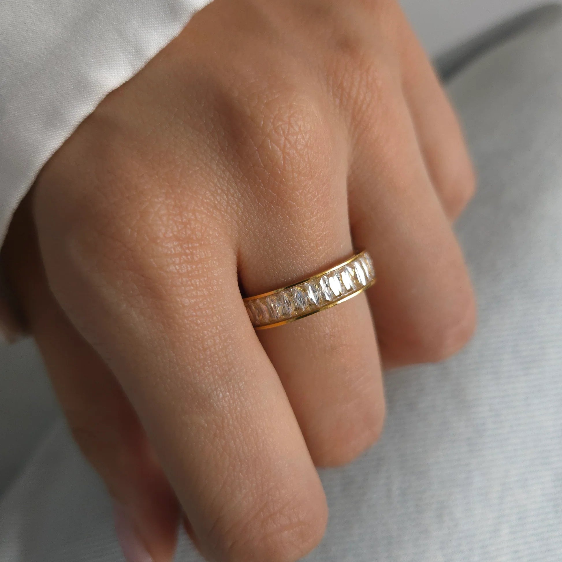 Timeless elegance meets modern sophistication in this stunning gold baguette eternity ring. Crafted with a sleek gold-plated band, the ring features a continuous row of precisely cut baguette stones that reflect light from every angle, creating an irresistible sparkle.