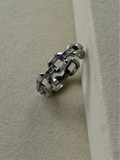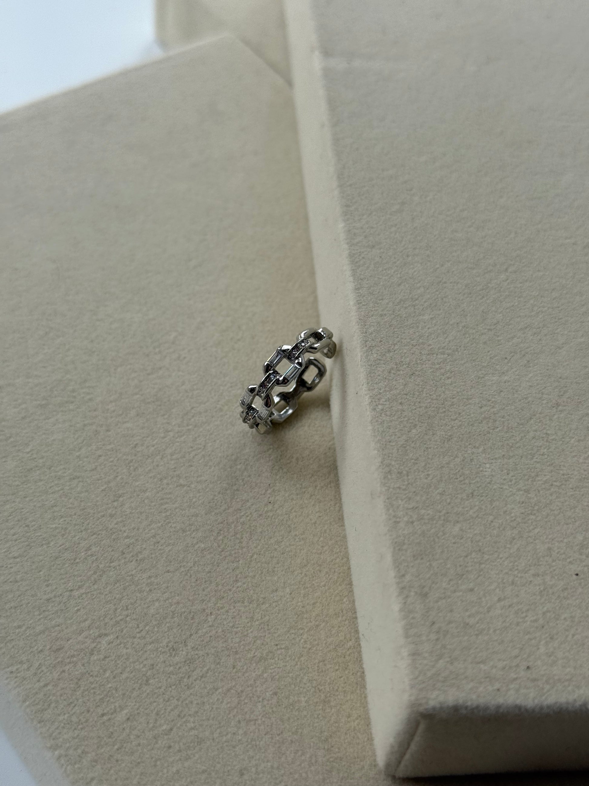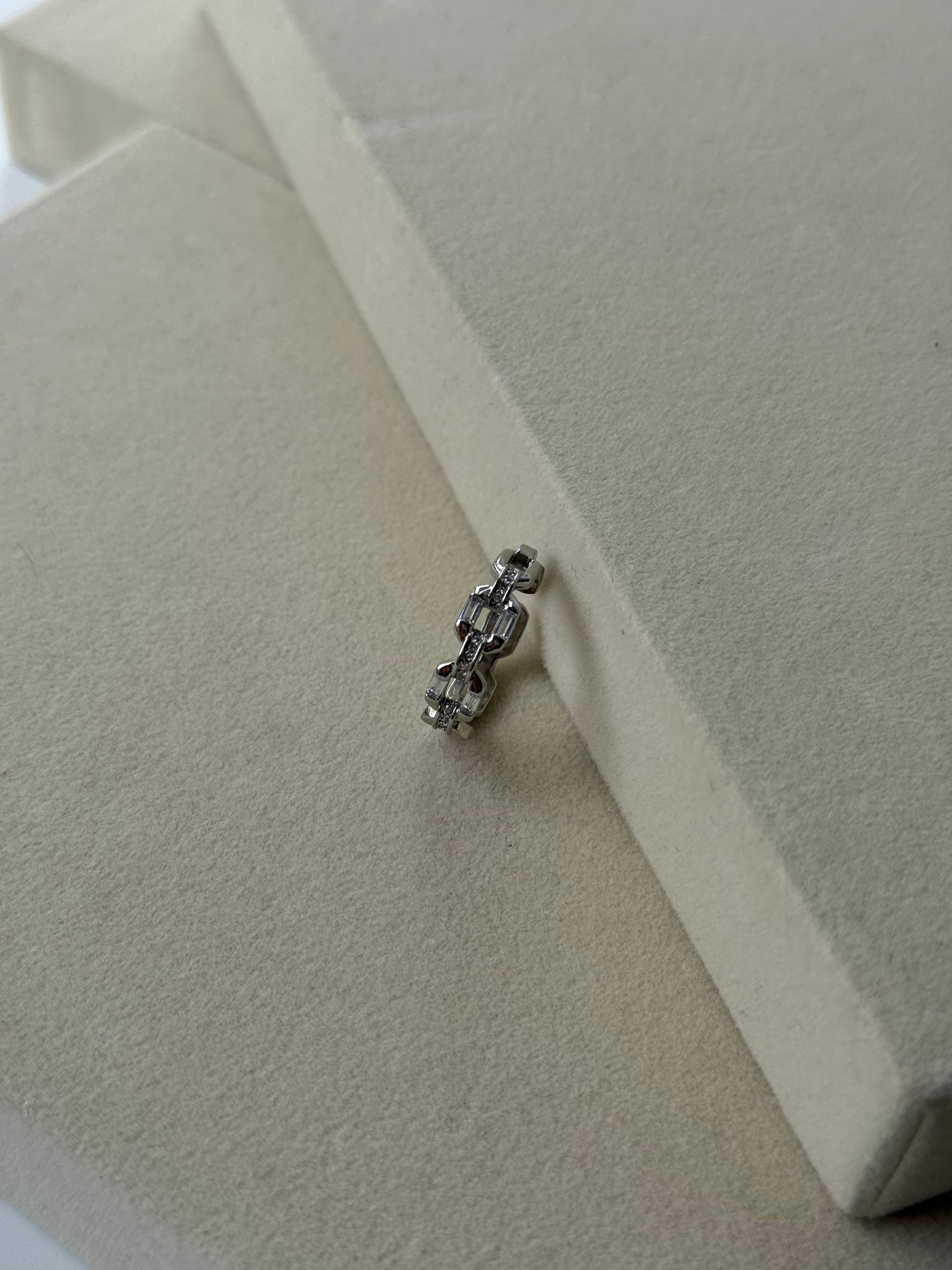 Sleek, modern, and effortlessly chic, this silver ring features a striking arrangement of baguette-cut stones set in a unique geometric pattern. The precision-cut crystals capture light beautifully, offering a subtle yet sophisticated sparkle.