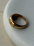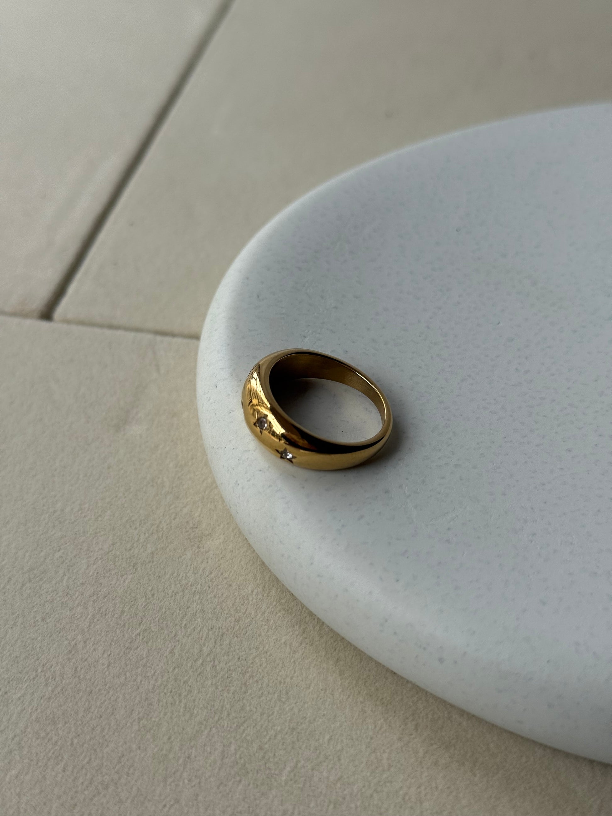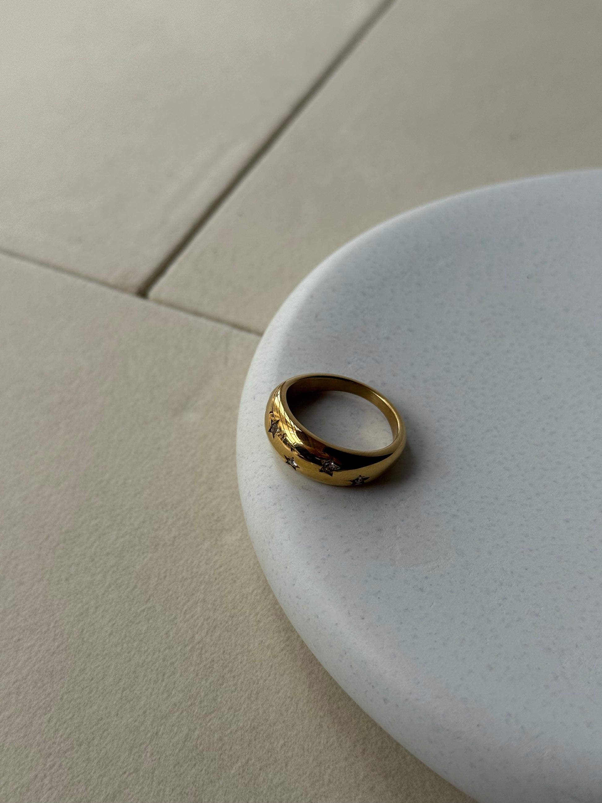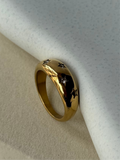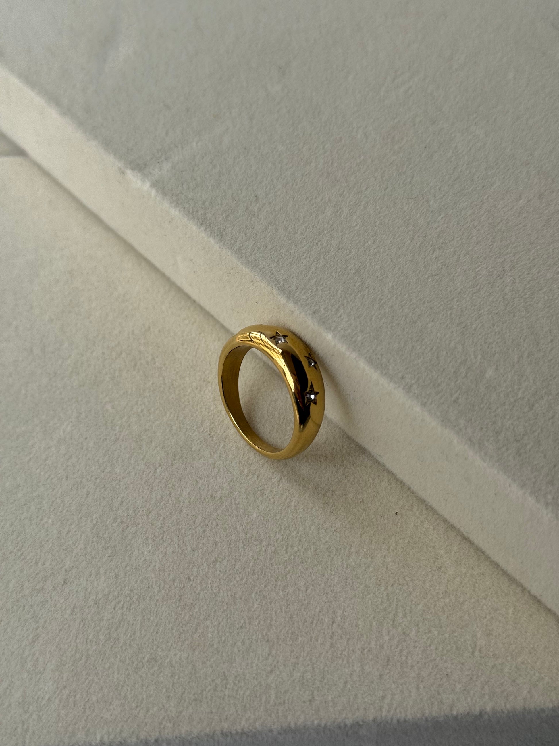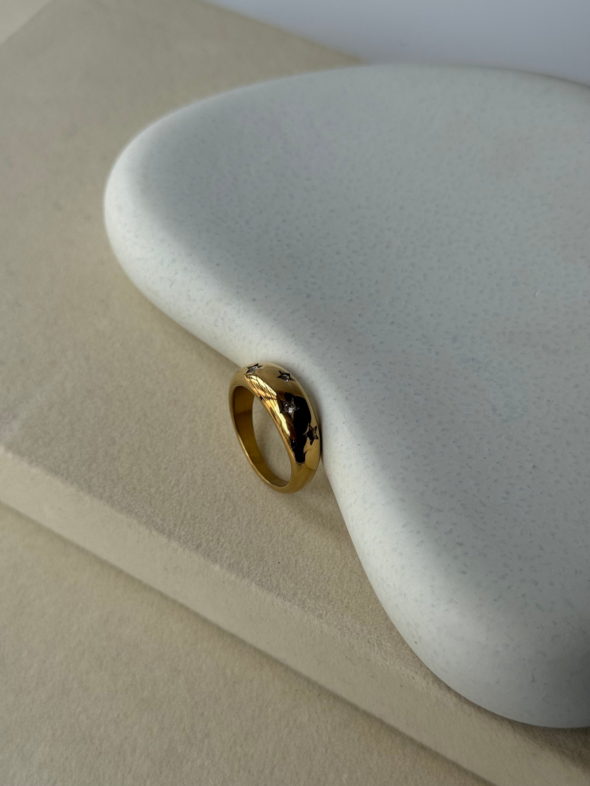 Inspired by the magic of the night sky, this elegant gold band blends minimalism with celestial beauty. Crafted with a smooth, high-polish gold finish, the ring features delicately engraved star motifs, each centered with a sparkling stone that catches the light with every movement.